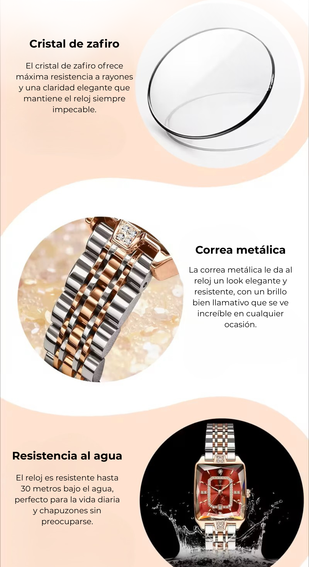 Cuarzo (MIYOTA 2415)- El movimiento es de cuarzo, lo que significa que funciona con pilas. Un movimiento de cuarzo es fácil de mantener y garantiza que el reloj funcione siempre con precisión.